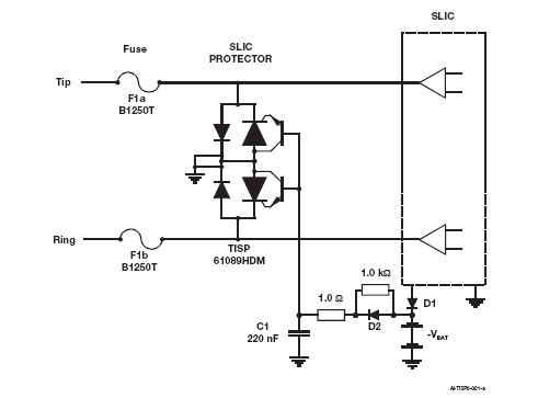 61089H features: (1)Dual, Voltage-Programmable SLIC Protector; (2)Low 15 mA max. Gate Triggering Current; (3)Supports Battery Voltages Down to -155 V; (4)High 150 mA min. Holding Current..