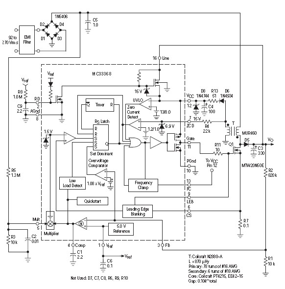 The MC33368D is an active power factor controller that functions as a boost preconverter in off–line power supply applications. MC33368D is optimized for low power, high density power supplies requiring a minimum board area, reduced component count and low power dissipation. The narrow body SOIC package of the MC33368D provides a small footprint. Integration of the high voltage startup saves approximately 0.7 W of power compared to resistor bootstrapped circuits.